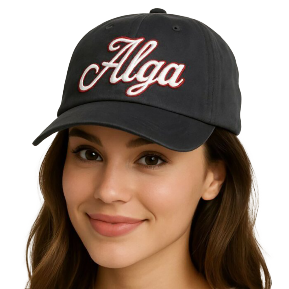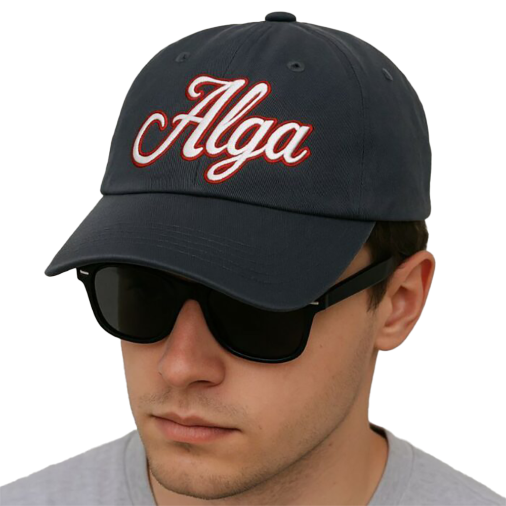 Бейсболку из плотной джинсовой ткани тёмно-серого оттенка украсили объёмной вышивкой Alga в каллиграфическом стиле. Контрастное обрамление букв подчёркивает характер надписи, а выцветшая фактура придаёт изделию винтажное настроение. Универсальная модель с акцентом на идентичность и движение вперёд.