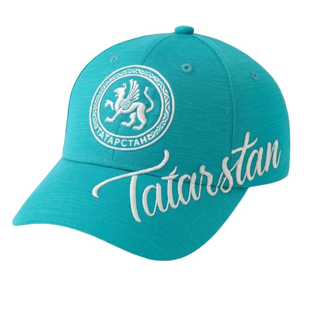 Бейсболку насыщенного бирюзового оттенка украсили вышивкой герба Республики Татарстан и крупной каллиграфической надписью Tatarstan вдоль козырька. Белая вышивка эффектно выделяется на ярком фоне, подчеркивая чистоту линий и национальную идентичность. Современный силуэт и премиальное исполнение делают модель стильным акцентом в летнем образе.