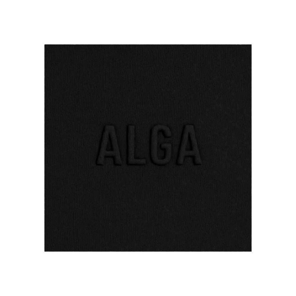 Главный акцент — выдавленная 3D-надпись ALGA, которая не напечатана, а формируется за счёт рельефа ткани. Глубокий чёрный цвет усиливает игру света и тени, подчёркивая премиальное исполнение и тактильную выразительность.